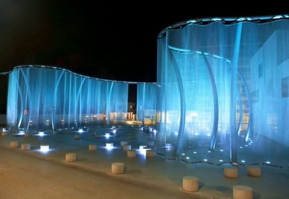 Swarovski, the luxury brand of precision-cut lead crystal glass, runs an indoor theme park called Swarovski Kristallwelten (Crystal Worlds) at the site of its original factory in Wattens, Austria. They recently completed this dramatic veil that lines the street outside the building. The stainless steel mesh veil was the winning design in a competition that Swarovski held. It was won by the design studio Regina Dahmen-Ingenhoven.